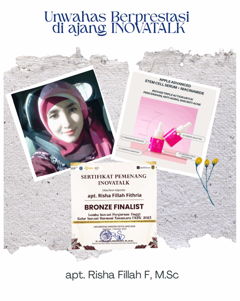 Karya inovasi yang diusung oleh apt. Risha Fillah F., M.Sc berupa apple stem cell serum dengan penambahan niacinamide, menunjukkan potensi besar dalam pengembangan produk berbasis bioteknologi untuk kesehatan dan kecantikan kulit. Inovasi ini tidak hanya mencerminkan keunggulan akademik, tetapi juga komitmen terhadap pengembangan riset aplikatif yang berdampak nyata bagi masyarakat.