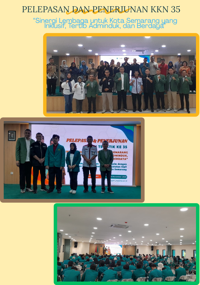 Semarang, 28 November 2025 — Universitas Wahid Hasyim (Unwahas) secara resmi melepas dan menerjunkan 181 mahasiswa dalam Program Kuliah Kerja Nyata (KKN) Tematik Periode 35 Tahun 2025 yang mengusung tema “Sinergi Lembaga untuk Kota Semarang yang Inklusif, Tertib Adminduk, dan Berdaya.” Kegiatan ini merupakan hasil kolaborasi strategis antara Universitas Wahid Hasyim dengan Dinas Kependudukan dan Pencatatan Sipil (Disdukcapil) Kota Semarang sebagai implementasi tridarma perguruan tinggi di bidang pengabdian kepada masyarakat. Acara ini diselenggarakan di Aula Fakultas Farmasi Universitas Wahid Hasyim dan dihadiri oleh pejabat pemerintah, pimpinan universitas, akademisi, dan mahasiswa peserta KKN. Agenda dimulai dengan pembukaan, pembacaan doa, dan prosesi pelepasan mahasiswa yang ditandai dengan penyematan atribut KKN secara simbolis.